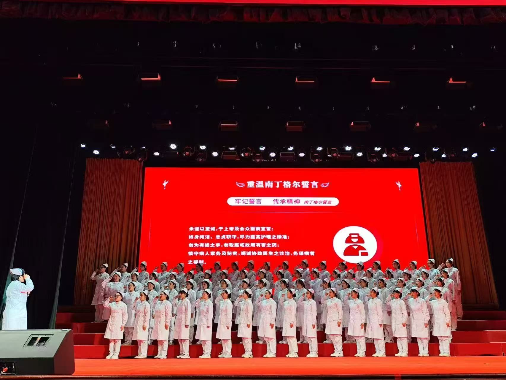 授帽完毕,全体护理学子在张会君的带领下,她们庄严宣誓,学习和发扬南丁格尔“燃烧自己,照亮他人”的精神;履行救死扶伤、防病治病的人道主义护士天职。她们铿锵有力的誓言,坚定了为护理事业奋斗终生的信心和决心。庄重的仪式,让每一位护理学子都感受到这份职业赋予的责任与荣耀。