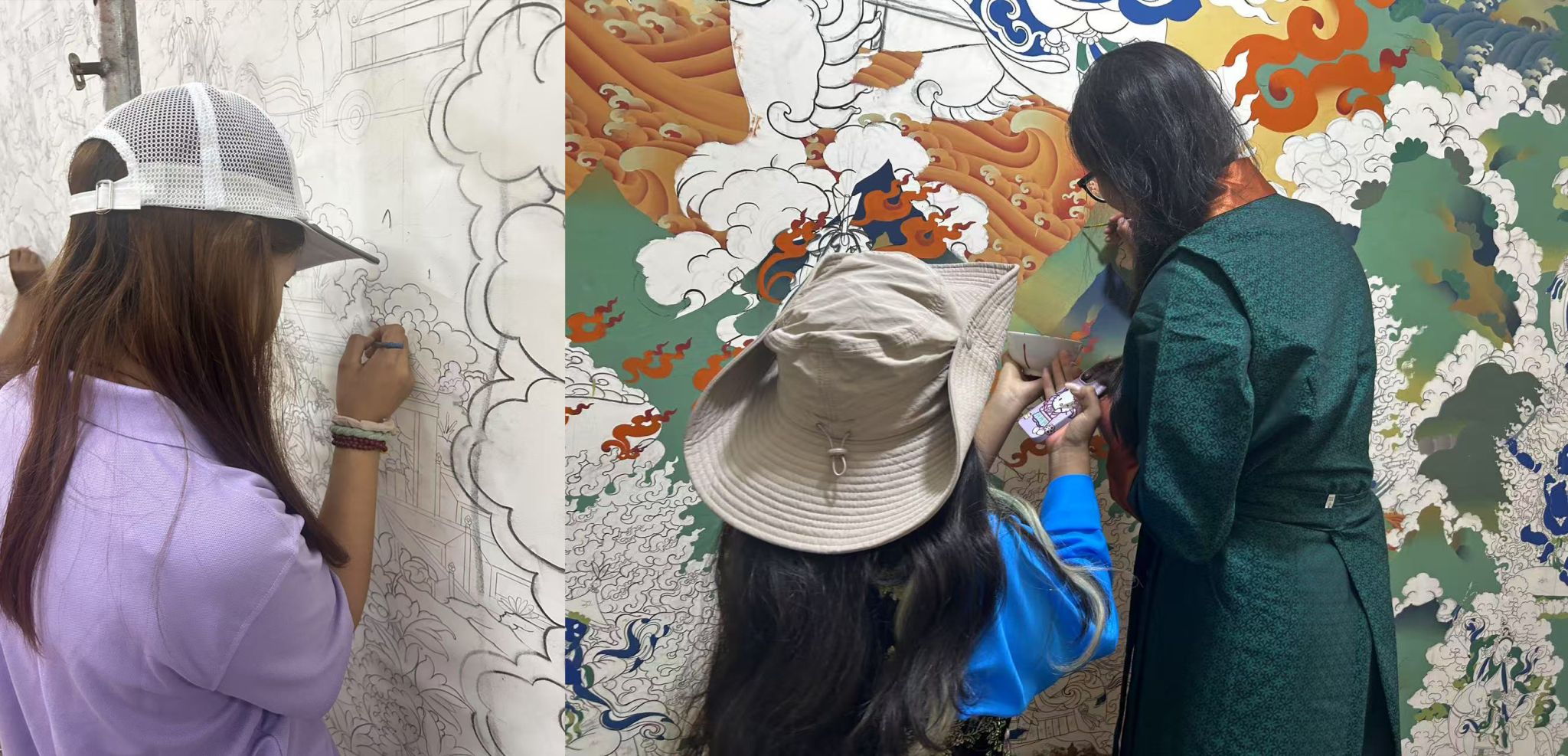 7月25日,实践团走进了唐卡的世界。唐卡作为藏族文化的“百科全书”,是传承千年的艺术瑰宝。近距离观赏唐卡,金、银、珍珠等天然矿物颜料构成色彩斑斓的画面,历经岁月洗礼仍鲜亮如新。在参观环节,唐卡大师为成员们悉心讲解唐卡画的历史渊源、复杂的绘制步骤和颜料使用。据介绍,一幅大型唐卡往往需要画师在房间中潜心绘制三年,期间需保持心境纯净、不受外界干扰、全身心投入。在体验环节,成员们拿起画具在老师的指导下尝试作画,没多久就已手腕酸痛,而画匠们一画就是半天、一天,日复一日,年复一年,可想而知每一笔都凝聚着对信仰的虔诚和对文化的敬畏。绚丽唐卡的背后,是无数人用热爱与坚持铸就的,大家觉得画师们比唐卡本身更伟大。在交流环节,前辈表示唐卡学问无穷,学了三十多年的大师仍在学习,“学问无止,学习不止”。此项实践让实践团成员们深受教育,学习和宣传民族艺术是每个人的责任,也懂得了做任何事,都要磨去浮躁,重在坚持,难在坚持。